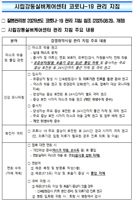 [공지사항] 시립강동실버케어센터 코로나 관련 지침 주요내용 안내 페이지 정보 작성자 최고관리자 댓글 0건 조회 85회 작성일 25-09-29 10:56 목록 본문 . 이전글시립강동실버케어센터 2025년 9월 업무추진비 사용내역 공고 25.10.02 다음글2025년 시립강동실버케어센터 위생용품(기저귀) 납품업체 최종 심사 결과 공고 25.09.19 댓글 0 댓글목록 등록된 댓글이 없습니다.